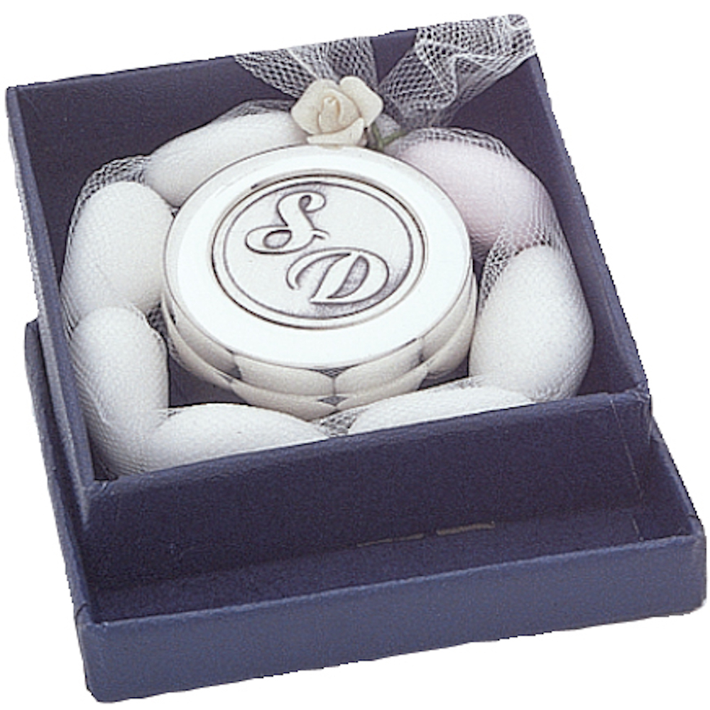 Favor box small round made of Silver 925 with embossed name or monograms in the center.